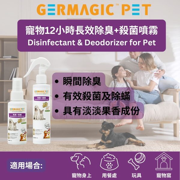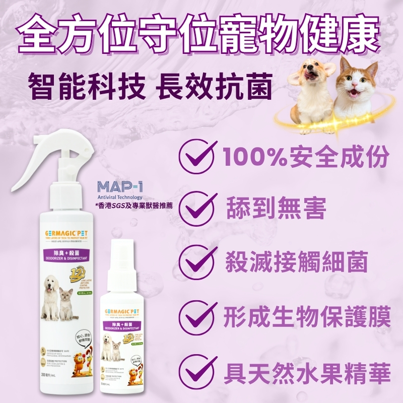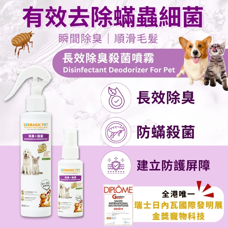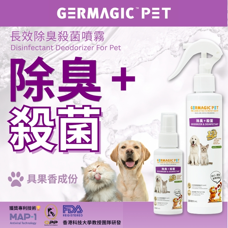 The 12 Hours Disinfectant Deodorizer uses the patented HKUST MAP formula with strong antibacterial properties. It combines natural plant extracts, wheat protein, Vitamin B5, and keratin to smooth fur and protect skin.